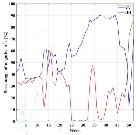The accuracy of scatterometer σ0s highly depends on the radar SNR. Lower SNR not only leads to poorer quality of σ0 estimation but also results in more negative σ0 values [22]. As shown in Equation (1), the noise contribution should be subtracted from the radar-measured power before the estimation of σ0; thus, a larger noise value is more likely to result in negative σ0. Theoretically, the ratio of negative σ0 values could be up to 50% at extremely low SNR conditions [22]. Figure 7 shows the percentage of negative σ0 s ( > 48° and < 2 m/s) as a function of the week number in 2021. Compared with the results of 2019 [1], it is clear that the number of negative σ0 values was overestimated (i.e., larger than the theoretical upper limit of 50%) for the VV beam, implying that the noise floor of the VV beam was overestimated in the L1 processing of CSCAT [17]. In contrast, the noise level of the HH beam was underestimated, notably around weeks 25–32, and week 37. Consequently, the problem of noise subtraction is the essential reason for the variation in σ0 quality.