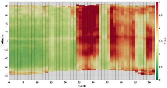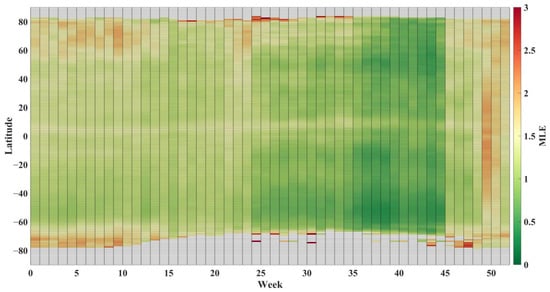In addition to σ0 stability, it is also relevant to evaluate the variation in the wind inversion residual (see Equation (5)), which directly reflects the quality of scatterometer-derived winds. Figure 8 illustrates the mean MLE value as a function of latitude (y-axis) and week number (x-axis) in 2021. As expected, it shows good consistency with the variations in the wind speed bias in Figure 1, as well as the temporal evolution of NOC coefficients in Figure 5a.