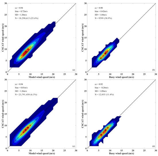 CSCAT NRT winds versus ECMWF wind speed (a) and buoy wind speed (b). Images (c,d) are the same as (a,b) but for the reprocessed CSCAT wind speed. Only the observations during weeks 25–32 are evaluated.
