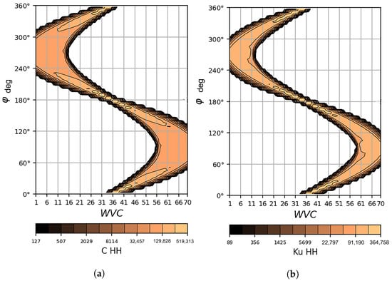 Azimuth angle distribution as a function of WVC: (a) C-band HH. (b) Ku-band HH.