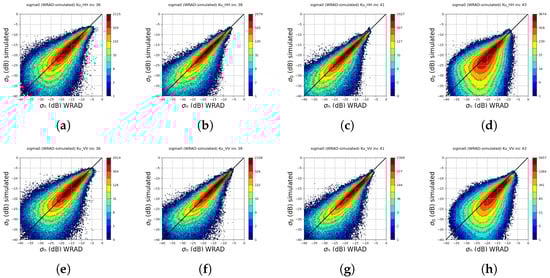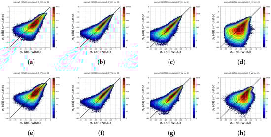 Joint distribution of C-band measured ° and simulated °, ascending orbits, date 1 March 2022–9 March 2022, HH (upper panel), VV (lower panel): (a,e) incidence angle 34°; (b,f) incidence angle 38°; (c,g) incidence angle 41°; (d,h) incidence angle 45°.