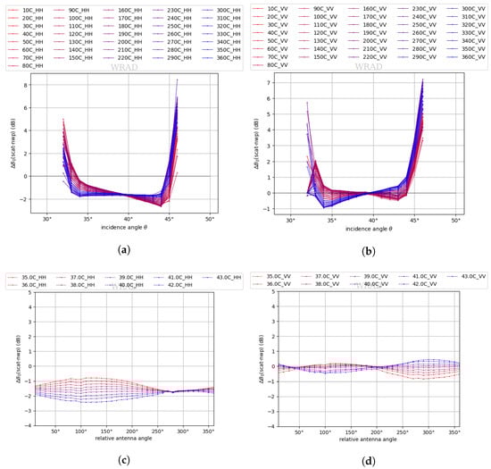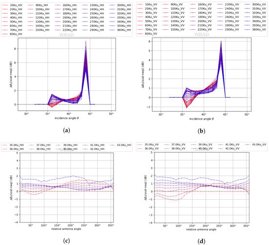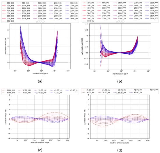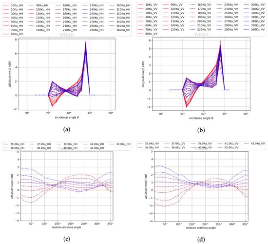 Ku-band NOCant (NOC as a function of incidence angle and relative antenna angle) for ascending orbits. The upper panel is as a function of incidence angle (x-axis) per relative antenna angle (red to blue lines), the lower panel is as a function of relative antenna angle (x-axis) per incidence angle (red to blue lines): (a,c) HH polarization; (b,d) VV polarization.