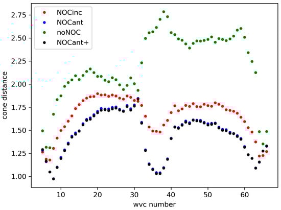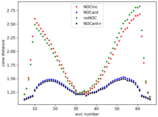 Average MLE (cone distance) as a function of WVC for C-band ascending orbits (noNOC is green, NOCinc is red, NOCant is blue, NOCant+ is black).