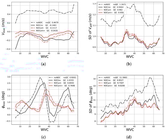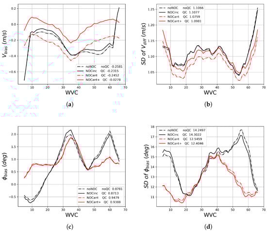 C-band ascending orbits wind retrieval statistics as a function of WVC with noNOC, NOCinc, NOCant, NOCant+. The mean numbers of each condition are stated beside each legend, data from 1–9 March 2022: (a) wind speed bias, (b) wind speed SDD, (c) wind direction bias, (d) wind direction SDD.