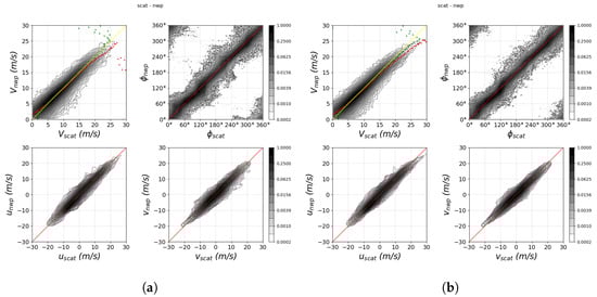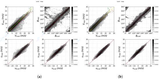 Figure 16 shows the retrieved winds compared with collocated ECMWF stress-equivalent winds in contoured plots for NOCant+ (including QC) and no NOC (no QC applied). The use of NOCant+ shifts the off-diagonal wind speed (Figure 16a, upper left) back to the diagonal. The use of QC reduces the rain contamination, which appears mostly as a lobe in the wind speed contour around a speed of 5–15 m/s. The wind direction ambiguity which is visible in the wind direction plots is also effectively reduced by NOCant+, resulting in more symmetric wind component scatter plots.
