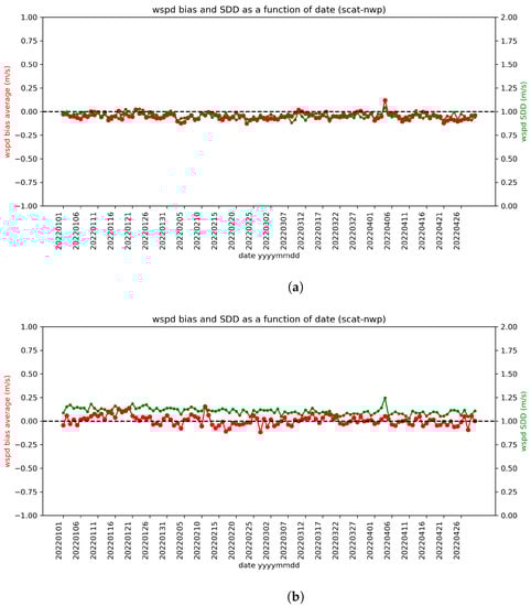 Wind speed bias and its SDD as a function of date (with NOCant+), from 1 January to 30 April 2022: (a) Ku-band, (b) C-band.
