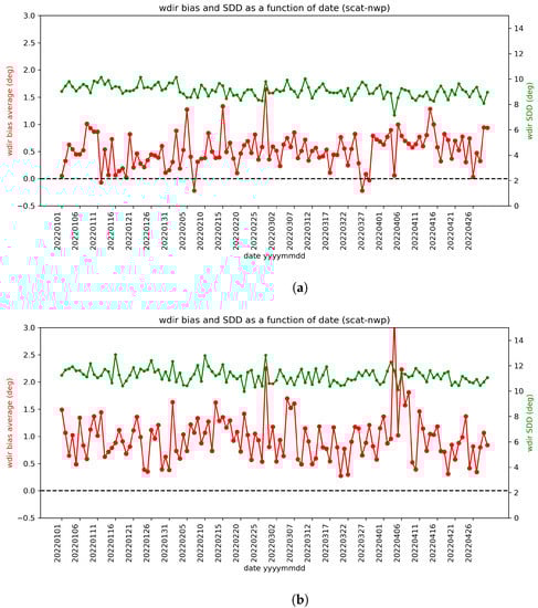 Wind direction bias and its SDD as a function of date (with NOCant+), from 1 January to 30 April 2022: (a) Ku-band, (b) C-band.