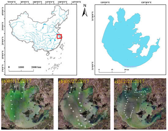The cloudless Landsat8-OLI (Operational Land Imager) Level-1 data were from the USGS (United State Geological Survey) and were processed to the Rrs data via the AC algorithms (details in Section 2.3.2). In this work, three OLI images of Lake Taihu (dates: 11 May 2017, 27 May 2017, and 21 December 2017) were matched with the in situ data to evaluate the performance of the AC algorithms. The time window of data matching was set as ±3 h of the Landsat8 overpass. The AC-driven Rrs data were obtained by averaging a 3 × 3 pixel (the coefficient of variation for these valid pixels was < 10%) area surrounding the sample point location [,,,]. A total of 71 sampling points were matched (11 match-up points from 11 May 2017; 22 match-up points from 27 May 2017; and 38 match-up points from 21 December 2017) (Figure 2).