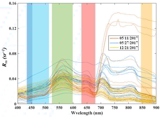 Measured remote sensing reflectance (Rrs) from Lake Taihu (dates: 11 May 2017, 27 May 2017, and 21 December 2017). The line color represents different sampling dates. The color column represents the wavelength range of each band of OLI (Deep blue: 443 nm band, Light blue: 483 nm band, Green: 561 nm band, Red: 655 nm band, Yellow: 865 nm band).