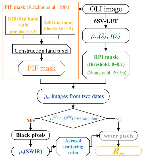 The PIFs are with features that do not change their reflectivity properties drastically over time in a scene []. The surface reflectance of PIFs is similar for the two dates. Hence, the difference between the Rayleigh-corrected reflectance (ρrc) of PIFs from two dates can be considered as the difference between two values of aerosol reflectance (ρa) of PIF. The black pixels are pixels consisting only of atmospheric radiance (Rayleigh scattering and aerosol scattering). If a pixel is a true “black pixel”, the difference between its ρrc for two dates is the same as the difference between its ρa for the same two dates (Equations (5)–(7)). Furthermore, theoretically, if the difference in the ρrc of a water pixel between two dates in the SWIR band is equal or approximate to the difference in the ρrc of PIFs between two dates, this water pixel can be taken as a “black pixel”. Therefore, the characteristics of PIFs can be used to more accurately obtain the BPIs for atmospheric correction. The flowchart of the m-ACZI algorithm is shown in Figure 4.