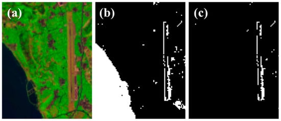 Example of the PIF mask determination. (a) False color image (R: SWIR band, G: NIR band, B: Blue band) with vegetation in green; (b) Construction land and water; and (c) PIF mask over airports near Lake Taihu, China.