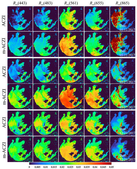 Comparison of the ACZI and the m-ACZI algorithms for OLI Rrs over Lake Taihu (dates: 11 May 2017, 27 May 2017, and 21 December 2017).