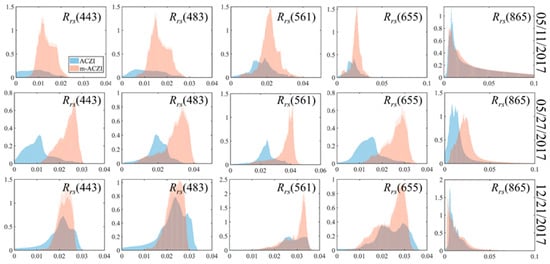 Frequency of Rrs retrieved using the ACZI (blue) and the m-ACZI (orange) algorithm in Lake Taihu (Dates: 11 May 2017, 27 May 2017, and 21 December 2017).