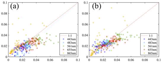 Scatterplots of Rrs derived by the ACZI (a) and the m-ACZI (b) algorithms versus in situ Rrs.