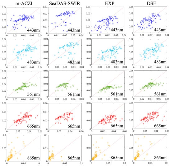 Only 54 match-up sample points were used to evaluate the SeaDAS-SWIR algorithm because some water pixels were masked by this algorithm (the “proc_ocean” option of SeaDAS was set to “2-force all pixels to be processed as ocean”). In Figure 10, the scatterplots of the m-ACZI algorithm were more concentrated, while those of other algorithms were discrete, especially in the 443 nm and 483 nm bands. The scatterplot distributions of the m-ACZI and the DSF were very similar in the 561 nm and 655 nm bands and were closer to the 1:1 line than others (Figure 10). The statistical results of the accuracy also supported these findings (Table 2). The assessment results from the m-ACZI and the DSF were very similar: the RMSE difference between them was less than 0.0008 in visible bands, and both were more accurate than the SeaDAS and the EXP algorithms. It should be noted that all the AC algorithms failed in the NIR band (RMSE > 0.0134 sr−1; sMAPE > 49.31%; Bias > 88.83%), and the m-ACZI algorithm showed the best comprehensive performance.