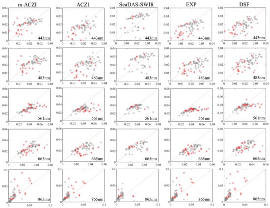 Scatterplots of AC-driven Rrs of different water types versus in situ Rrs. The red points represent water with floating blooms, and the gray points represent un-floating blooms.