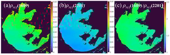 Solving the aerosol scattering of nonblack pixels relies on the assumption of the spatially uniform distribution of aerosol types for the m-ACZI algorithm. This assumption has been recognized by a great amount of research [,,,,]. For example, the DSF and EXP adopted this assumption for the atmospheric correction process. Taking the Lake Taihu image without algal blooms (obtained on 2 February 2016) as an example (remove cloud pixels) (Figure 12), the spatial distributions of ρrc (1609) and ρrc (2201) were uniform, and the standard deviations of ρrc (1609) and ρrc (2201) were 0.0026 (average: 0.0218) and 0.0016 (average: 0.0137), respectively. The standard deviation of ρrc (1609)/ρrc (2201) was 0.0546 (average: 1.5944) (Figure 12). This suggests that Lake Taihu is consistent with the assumption of the spatially homogeneous distribution of aerosol types.