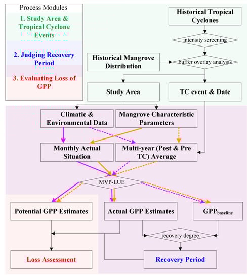 In the present study, the identification of a year means a cycle year instead of a calendar year. One year is calculated as the twelve months from the month when a TC hits to the previous month of the next year. For example, if a mangrove forest was hit by the typhoon in October 2016, in this situation, the year before typhoon is from October 2015 to September 2016, and the year after the typhoon is from October 2016 to September 2017. The multi-year averaged GPP have been selected as the recovery reference baseline, which is calculated by multi-year averaged monthly environmental condition and the multi-year averaged monthly vegetation state without the TC attack year. In this present study, if the annual GPP exceeded 95% of the baseline value for more than two consecutive years after the TC attacked, then it can be judged that the mangrove ecosystem has recovered. Otherwise, we considered that it is still in the process of recovery. The GPP estimated based on the multi-year average vegetation state and environmental conditions during the recovery period represents the potential GPP during the recovery period. The GPP estimated based on the actual vegetation state and environmental conditions during the same period represents the actual GPP. The estimation of actual, baseline, and potential GPP could be well understood by the flowchart (Figure 1). The difference between these two values indicates the GPP loss caused by TCs.