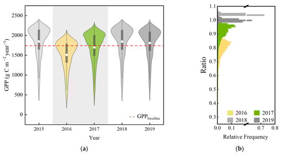 The timeseries of annual GPP of the mangrove ecosystem pre- and post- SuperTY Sarika (a) and the distribution of ratio of each year after the typhoon to the GPPbaseline (b).