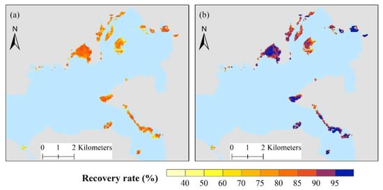 The GPPbaseline, which is the multi-year average annual GPP of mangroves in Danzhou Bay without TC disturbance (SuperTY Sarika in 2016), was 1824.56 ± 392.72 gC/m2/yr during the study period. Therefore, according to the mangrove recovery rules defined in this study, when the average of GPP of the mangrove ecosystem in Danzhou Bay can reach the standard value of 1732.80 (95% of GPPbaseline) for two consecutive years, it could then be considered as they have already recovered from disturbance. From 2015 to 2019, the GPP of the mangrove ecosystem in Danzhou Bay were 1848.31 ± 397.22, 1511.22 ± 371.02, 1698.01 ± 400.37, 1844.30 ± 397.40, and 1808.51 ± 387.83 gC/m2/yr (spatial distribution can be seen in Figure S5). As shown in Figure 3a, the GPP generated by the mangrove ecosystem in Danzhou Bay in 2016 and 2017 was below the standard value and reached the standard for two consecutive years in 2018 and 2019. Therefore, it is judged that the recovery period was 2 years, and the mangrove ecosystem had recovered in 2018. Among them, from 2016 to 2017, 72.82% of the mangrove ecosystem GPP recovered to 95% of the baseline, and the rest of the mangrove ecosystem is still in the process of recovery; from 2017 to 2018, all mangroves recovered from the SuperTY Sarika impact (Figure 3b). Spatially, combined with Figure 4, the mangroves that recovered relatively quickly are mainly distributed on the inner side of the harbor (the side of the land facing away from the typhoon), while the part exposed to the open water recovered relatively slowly. The GPP of the mangroves farther from the typhoon’s track recovered faster than those closer to it. Meanwhile, the mangroves in the same range of distance from the typhoon track, closer to the offshore, recovered faster.