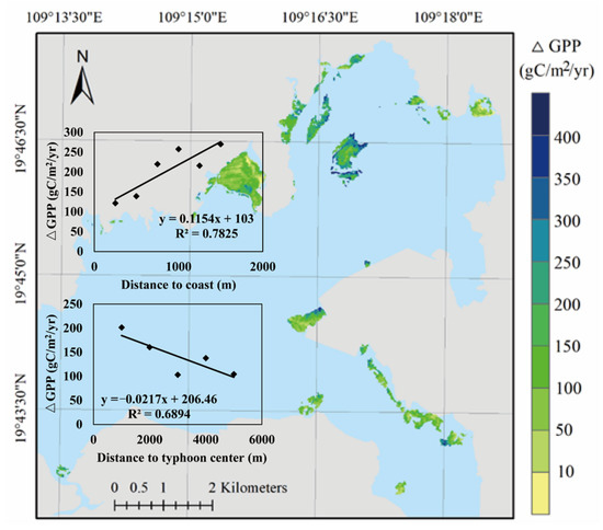 The damage brought by SuperTY Sarika to the mangrove GPP in Danzhou Bay lasted for 2 years, and it had recovered to the pre-disturbance state. In the two years, if the mangrove had not been affected by SuperTY Sarika, the GPP of 1683.65 ± 362.85 and 1812.04 ± 387.78 gC/m2/yr could have been generated. On average, the annual loss of GPP could reach 143.29 ± 84.89 gC/m2/yr, and the most severe area could exceed 600 gC/m2/yr which was more than half of the multi-year average (loss rate of GPP over 65% and a total of 1294.02 gC/m2 in two years). Meanwhile, there were also some mangroves not affected by SuperTY Sarika (the average annual loss rate of mangrove forests in 1.92% of the area is less than 1%). The spatial distribution of the annual GPP loss is shown in Figure 3, and the averaged annual loss rate was 8.39 ± 6.01%/yr. We used the buffer analysis to establish the correlation relationship between the distance to the coastline and the distance to the typhoon eye and GPP loss (Figure 5 subplot). Each point represents the average loss within the 1 km buffer zone, and the five points in the figure are 0~1, 1~2, 2~3, 3~4, and 4~5 km. The loss of mangrove GPP decreased with the increase in the distance to the track of SuperTY Sarika, and the linear average was 21.68 gC/m2/yr/km (R2 = 0.69). Simultaneously, the losses increased as the distance to the coastline increased (from land to sea) with the linear average loss rate of 115.42 gC/m2/yr/km (R2 = 0.78).