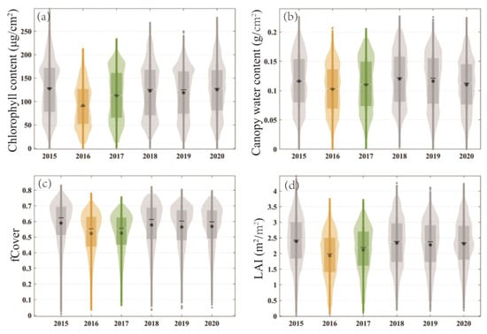 Interannual variations in mangrove canopy parameters (chlorophyll content (a), canopy water content (b), fCover (c) and LAI (d)) from 2015 to 2020.