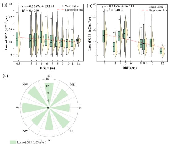 The relationship between loss of GPP and canopy height (a), DBH (b), and aspect (c).
