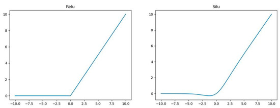 In addition, Silu [30] is used instead of the Relu activation function. The Relu activation function is set to zero when the negative gradient is negative, causing some neurons to “necrotize” and affecting network convergence. Silu has the characteristics of no upper bound and lower bound, smooth, and non-monotonic, avoiding negative gradient zeroing to reduce neuronal “necrosis”, and better gradient descent than Relu. A comparative plot of the Relu and Silu activation functions is shown in Figure 3. It can be seen that when the function is in a negative gradient, the Relu is set to zero, causing the neural network to fail to learn useful knowledge and neuron “necrosis”. In contrast, the Silu function avoids zeroing the negative gradient, retains part of the buffer to reduce neuron “necrosis”, and has a better overall gradient descent than Relu. Therefore, this section introduced an improved RepVGG block instead of the partial convolutional layer to optimize the backbone and improve the model’s extraction of multi-scale target features.