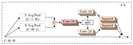 The coordinate attention (CA) mechanism is an attention mechanism that enhances the perceptual ability of neural networks by embedding spatial coordinate information into them to better capture the correlation between different locations. CA is divided into two steps: embedding coordinate information and generating coordinate attention, which encodes channel relationships and long-term dependencies using precise location information to fully capture the region of interest and the relationship between channels [33]. The mechanism aggregates the input feature maps along the X and Y directions through two global average pooling operations and then encodes the information through dimension transformation. Finally, the spatial information and channel features are weighted and fused, considering the channel and location information. Therefore, CA can better focus on the object of interest, as shown in Figure 5.