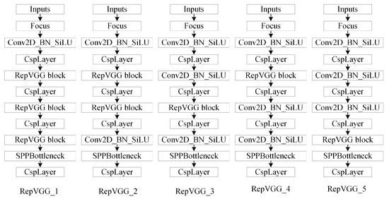 In the improvement strategy for the backbone, if it is a direct addition of RepVGG modules, it may not necessarily have the desired effect. To explore the effectiveness of the RepVGG addition position, this paper added the RepVGG block to the backbone to determine the RepVGG block addition position. The different addition positions are shown in Figure 8.