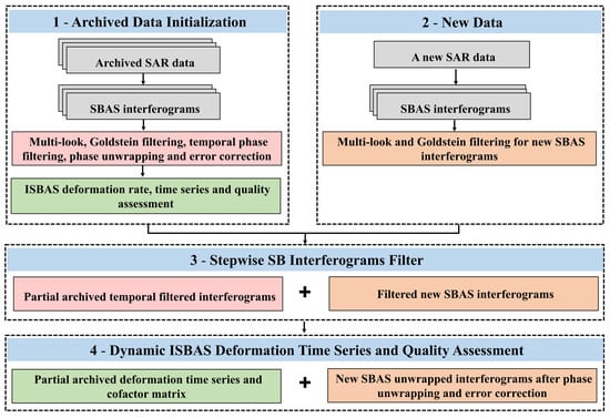 Figure 1 shows the flow chart of the proposed approach, including four steps. First, we initialize the interferograms, deformation parameters, and the quality file. Second, when we obtain a new SAR image, new filtered SB interferograms are added. Third, we execute stepwise SB interferograms filtering. Finally, we update the ISBAS deformation time series and its quality.