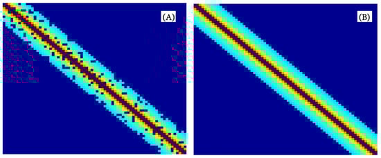 where the R matrix is determined by the SB interferograms (design matrix A), is the noise, and I is the identity matrix. represents the number of redundant observations for SB interferograms. The residual error is determined by the matrix and noise . is the redundant observation component (). More redundant observations result in a higher value. When = 0, the number of redundant observations is 0, which is a chain SB interferograms. All noise of observations is transferred to the deformation parameter, resulting in the fluctuation of the deformation time series. When = 1, the observation error is totally transferred to the residual error, which means the observation is unnecessary.