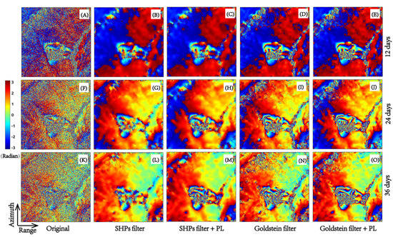 We use multi-look filtering (1:4), the Goldstein filter, and the PL method to improve phase stability, as shown in Figure 7, where the first, second, and third lines correspond to interferograms with time spanning 12, 24, and 36 days, respectively. The first column (Figure 7A,F,K) shows the original interferograms. The second column (Figure 7B,G,L) shows the interferograms filtered by SHPs [51]. The third column (Figure 7C,H,M) shows the filtered interferograms by SHPs and PL. The figures in the fourth column (Figure 7D,I,N) show the Goldstein-filtered interferograms. The fifth column (Figure 7E,J,O) shows the filtered interferograms by Goldstein and PL. Compared with the spatial averaging of SHPs, the Goldstein filtering could maintain the detailed features of the interferometric fringes very well in the large gradient deformation areas. The interferometric fringes are clearer after Goldstein filtering and the PL method, as shown in Figure 7E,J,O.