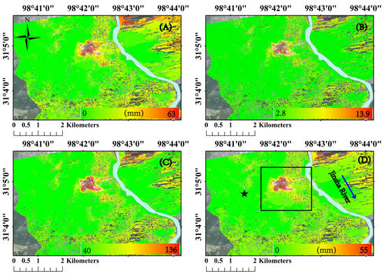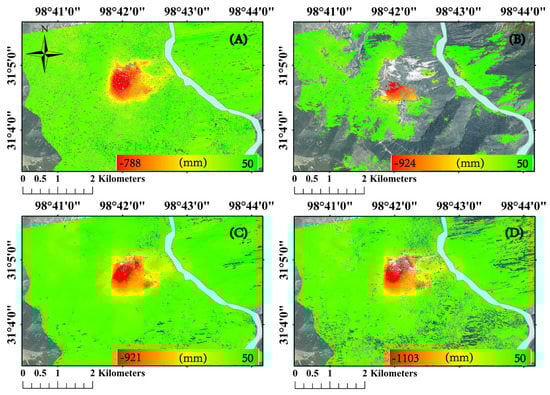 Cumulative deformation by different approaches. (A) Traditional ISBAS method with Goldstein filtering; (B) DS-SBAS method with Goldstein filtering and the PL method; (C) DS-ISBAS method with the SHPs filter and PL method; (D) DS-ISBAS method with Goldstein filtering and the PL method.