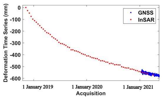 The comparison of InSAR- (red dot) and GPS LOS-projected (blue dot) deformation time series is shown in Figure 12, which is located at pixel P3 in Figure 11A. To some extent, the results demonstrate the reliability of InSAR to obtain deformation in the Baige landslide.