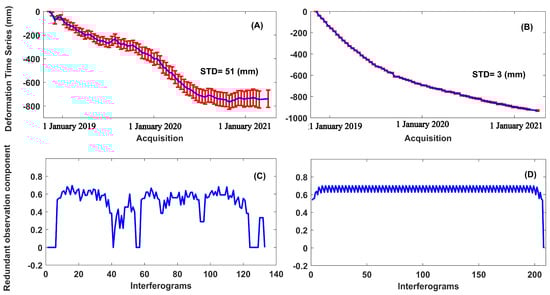 The deformation time series of pixels P1 and P2 are shown in Figure 13, in which Figure 13A,B is the deformation time series with different STD (51 and 3 mm, respectively), and Figure 13C,D shows the redundant observation components with different number interferograms (61 and 136, respectively).