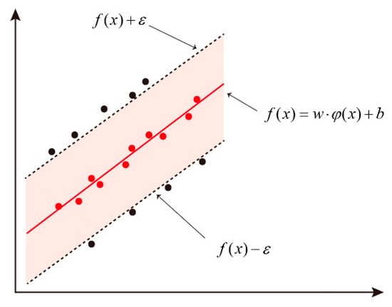 Support vector regression (SVR) is a vital application branch of support vector machines (SVM) [26]. SVR transforms a special type of hyperplane that is linearly separable into a convex quadratic programming problem (as shown in Figure 1), which is essentially a feedforward neural network with a nonlinear unit hidden layer. SVR has shown good performance in fitting and predicting time series, and comes in two forms: linear support vector regression and nonlinear support vector regression. The goal of SVR is to find a hyperplane that minimizes the total variance of the distance between the training set and the hyperplane, and it has strong generalization ability and a simple structure, making it commonly used for the inversion of small sample water quality parameters. Assuming the following sample set: , ,. First, establish the following regression function Equation (1):