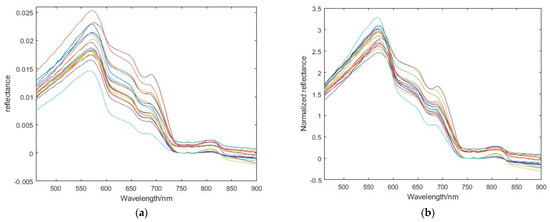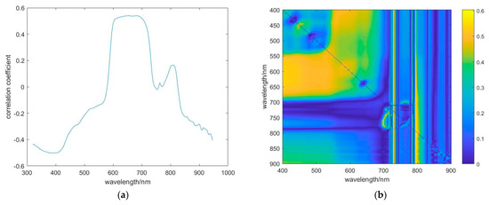 The original spectral curve measured in the field is shown in Figure 6a. After normalization, the result is shown in Figure 6b. The normalized spectral curve has a more pronounced reflectance peak and trough than the original. Pearson correlation analysis is a method to study the strength of the correlation between two or more random variables from the perspective of statistics. When the Pearson correlation analysis was carried out, the input forms included single band, band ratio, band difference, and NDVI-style ratio. It has been shown that the combination of bands can effectively attenuate the effects of other environmental factors, such as water surface smoothness and microwaves [32], thus improving the inversion accuracy of the model.