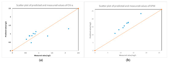 Image sampling point inversion value and measured value scatter plot: (a) Chlorophyll a; (b) SPM.