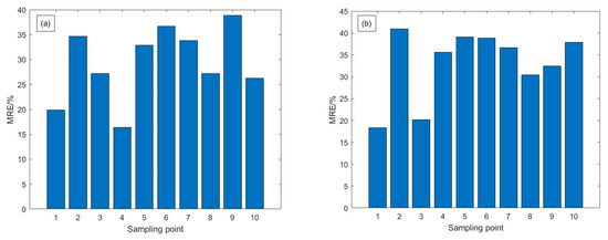 The improved DE-GWO-SVR model was used to convert chlorophyll a and suspended matter concentration on Sentinel-2 satellite data. To further validate the model’s accuracy on Sentinel-2 satellite images, 10 sampling points were selected for validation at the same time and location as the Sentinel-2 satellite image acquisition, and the correlation between the inversion values of the sampling points and the measured values was analyzed. The scatter plots of the inversion values of the sampled points and the measured values were obtained by statistical regression, as shown in Figure 9. The relative error results of each issue are shown in Figure 10.