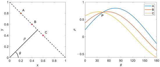 If is restricted to , each line in the plane corresponds to a unique parameter pair . For a fixed point (point A), Equation (10) is equivalent to