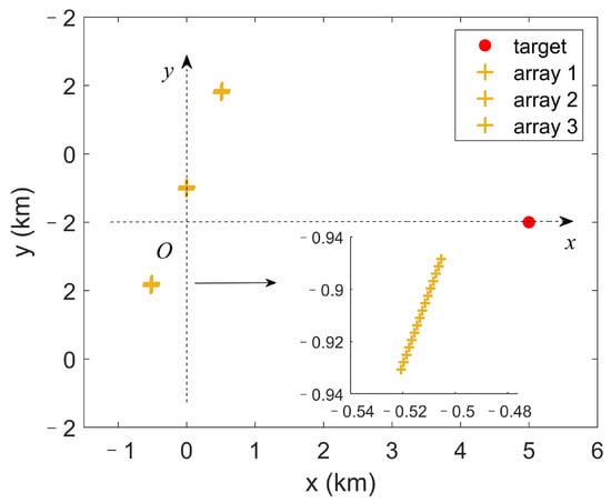 As shown in Figure 3, assume the sonar system consists of three 16-element horizontal linear uniform arrays with half-wavelength inter-element spacing, and the working frequency is 250 Hz. The line-of-bearing of each array is clockwise from north, and the distance between neighboring arrays is 1500 m. In the simulations, we use a shallow-water scenario similar to the SWellEx-96 experiment environment. The SWellEx-96 experiment was conducted between 10 and 18 May 1996, approximately 12 km from the tip of Point Loma near San Diego, California. A model environment is built with a measured sound speed profile (SSP) in the water column (collected on 13 May 1996 at 16:18 GMT) and a fluid seabed model consisting of two sediment layers with gradient sound speeds (constant density and attenuation) over a homogeneous half-space. The seabed geoacoustic model parameters can be found in [38]. A 10 km × 10 km monitoring area with a 50 m grid spacing is considered, which is 1000 m to 11,000 m along the x-axis, and m to 5000 m along the y-axis.