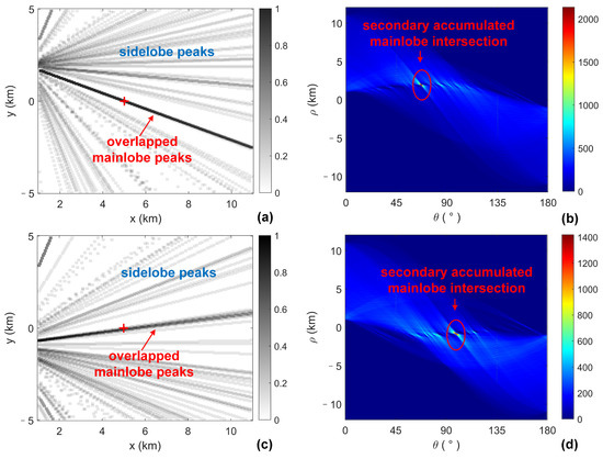 Figure 5 show the wideband PD patterns and the results of the secondary accumulating matrices. Comparing Figure 4 and Figure 5, we can find that the mainlobe lines of different frequencies overlap and highlight, while the values of the sidelobe lines are much lower than the mainlobe lines. Likewise, there appears a prominent intersection in the secondary accumulating matrix, which indicates the integration of the primary accumulating matrices. Based on the results of the secondary accumulation, the intersection corresponding to the mainlobe lines is easily identified, and the narrowband mainlobe peaks can be recovered.