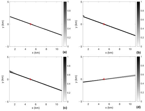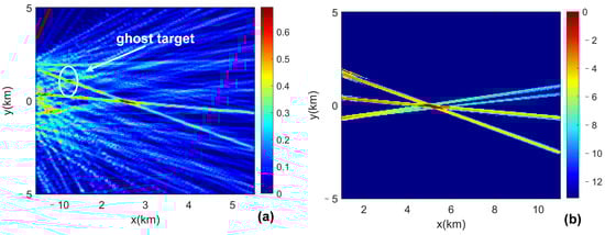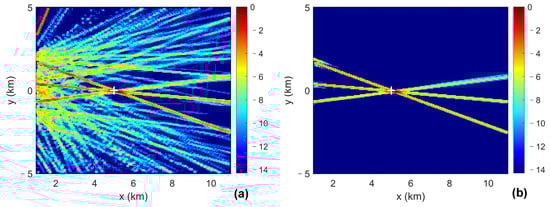 The next step is to construct the inter-array intersection pattern with the recovered wideband mainlobe lines of peaks. Figure 7a shows the inter-array intersection pattern of the Basic-FLFL method. The advantage of applying a “filtering” process to the spatial features with the Hough Transform is prominent as shown in Figure 7b. Firstly, the background is made much clearer by eliminating the sidelobe peaks, and the intersection area of the mainlobe lines is easier to identify. Secondly, the chance to produce a “ghost target” indicated by the intersection of the mainlobe line and sidelobe line is decreased. It is worth noting that the localization results of the two methods are the same in this scenario: m with a 70.7 m localization error. This indicates that the above-discussed advantage is not realized by sacrificing the localization accuracy, which is verified by the following Monte Carlo simulation results.
