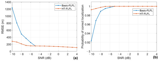 Figure 8a shows the localization performance of the Basic-FLFL method and the proposed HT-FLFL method in terms of RMSE (root-mean-squared error) with the SNR level ranging from dB to 4 dB. Next, 3000 Monte Carlo trials are conducted to obtain the RMSE results of the two methods. We can see that the two methods have similar localization accuracy in medium to high-SNR scenarios, while the localization performance of the Basic-FLFL method decreases quickly in low-SNR scenarios. This phenomenon can be explained with the results in Figure 8b and Figure 9. Correct localization means the estimate of the target location lies within the intersection area of the mainlobe lines of peaks, and the probability of correct localization is defined as the percentage of correct localization for the 3000 trials. It is shown that the probability of correct localization is 1 for both methods when the SNR is above dB, where the two methods have equivalent localization accuracy. For SNRs below dB, the Basic-FLFL method may be interfered by the sidelobe peaks and get wrong localization results (as shown in Figure 9), leading to larger RMSE results. On the contrary, the proposed HT-FLFL method has stable performance with decreased SNR owing to the elimination of the sidelobe peaks. It is worth noting that when considering the RMSE of the correct localization results, the two methods have comparable localization accuracy. This indicates that the application of the Hough Transform improves the robustness in low-SNR scenarios without sacrificing the localization accuracy.