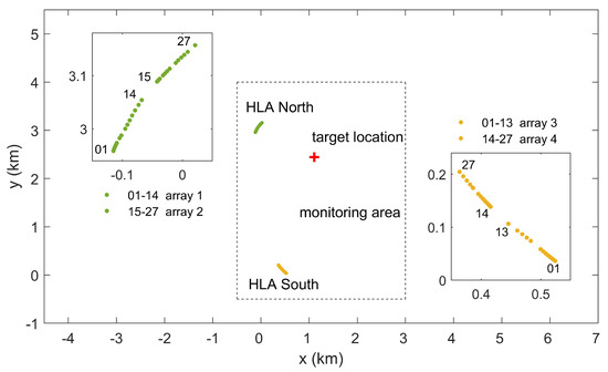 (Color online) Geometric plot of the 27-element subsets of the two horizontal line arrays and the source location to be estimated. Filled green and yellow circles indicate HLA North and HLA South, respectively. The four small-aperture arrays 1 to 4 are indicated by element indices. The red plus mark indicates true source location investigated. The box with dotted lines marks the edge of the monitoring area.