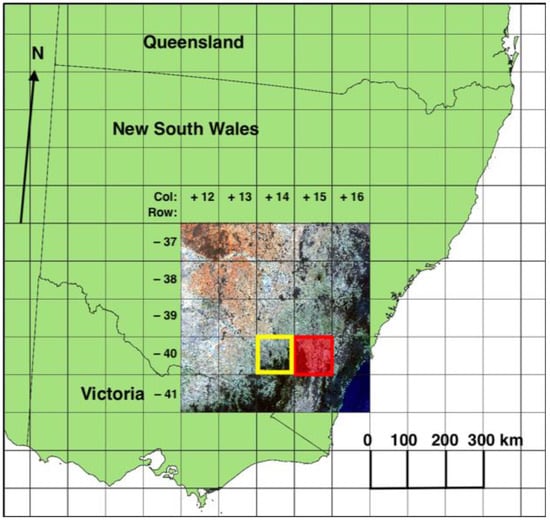 The study area (Figure 1) was an area of approximately 500 km × 500 km (~400 million pixels) in south-eastern Australia for which annual Landsat geomedian data at 25 m resolution [] was available in GDA94/Australian Albers projection (EPSG:3577) from Geoscience Australia. Annual geomedian data are pixel composites generated using a high-dimensional statistic called the ‘geometric median’, which enables the production of a representative cloud-free annual composite image []. Pixel-based compositing methods have been used to exploit large data volumes on annual or seasonal time scales to create representative images [] as inputs to machine learning model development.