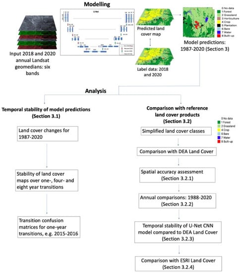 Here, our focus was on the spatial and temporal stability of annual U-Net CNN model results compared to pixel-based classifiers and reference land cover products. Specifically, the following analyses were carried out on U-Net CNN model results for 1987–2020 using a combination of Python programs, the open-source Geographic Information System QGIS, and spreadsheets in Microsoft Excel: