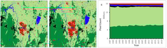 U-Net CNN model results for 1987 (a); and 2020 (b); and land cover class distribution (c) (legend as for Figure 3).