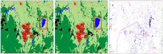 Of the one-year transitions, the pair of years with the least change was 2015–2016 (Figure 5). Some minor differences between 2015 and 2016 occur over Lake George (red box) and in Plantation, Forest and Built-up classes. Table 7 shows a transition matrix for 2015–2016, highlighting transition categories: no change, possible, unlikely and implausible changes. Of the implausible changes, the most common ones are from Built-up to Grassland (0.25%), Forest to Plantation (0.21%), Plantation to Forest (0.17%) and Grassland to Forest (0.16%) which largely appear to be edge effects associated with class boundaries (Figure 5 and Supplementary Materials Table S1).